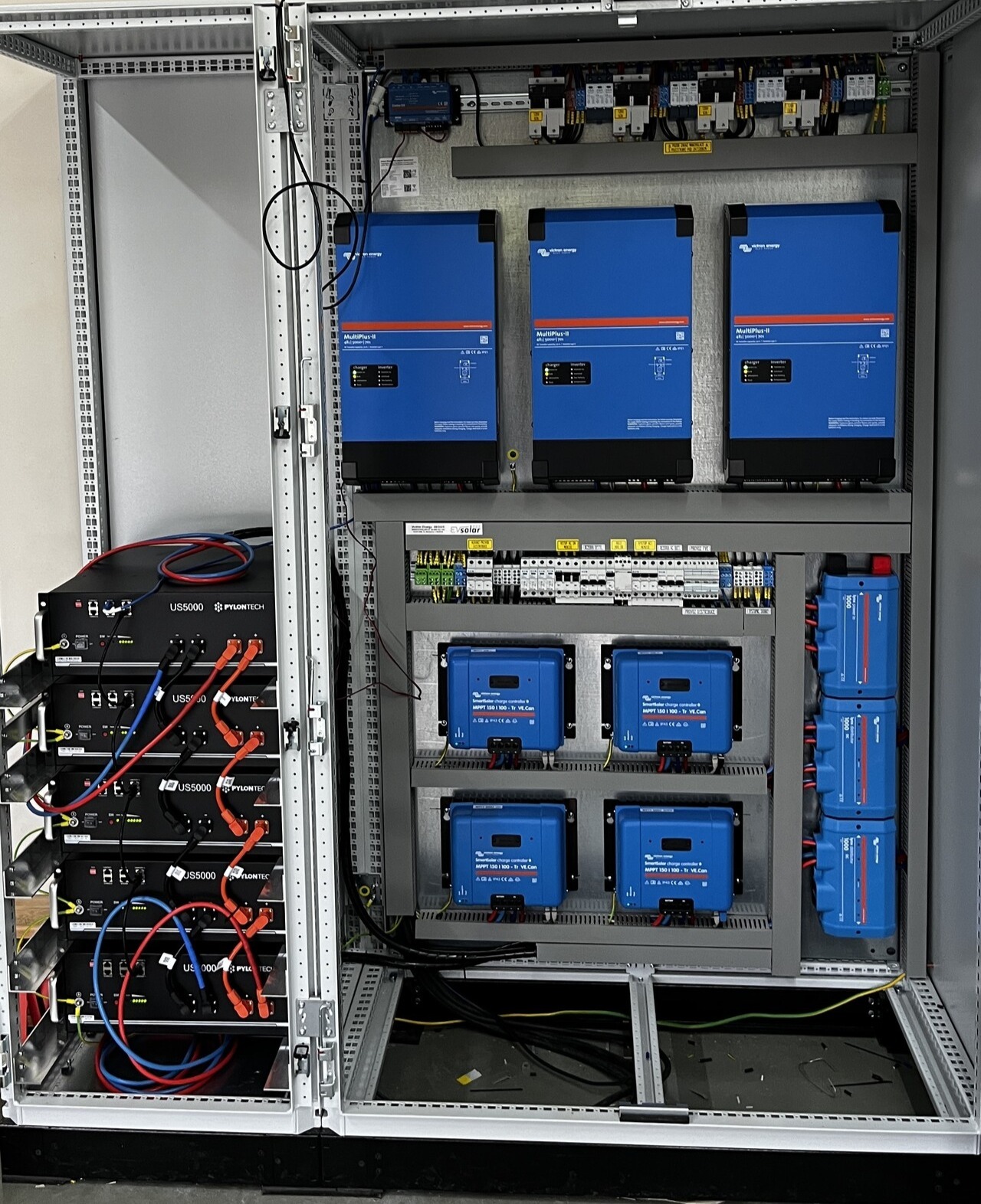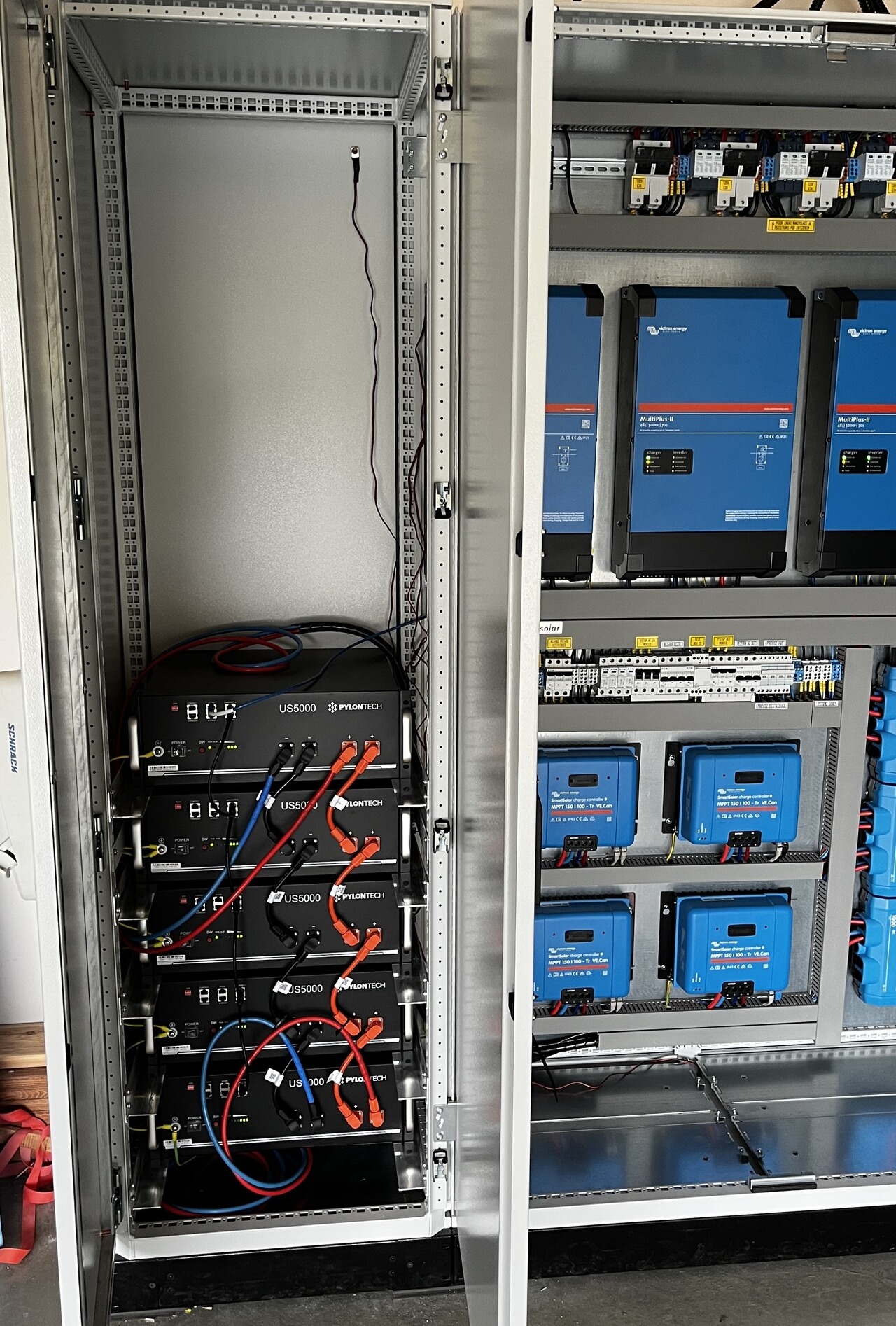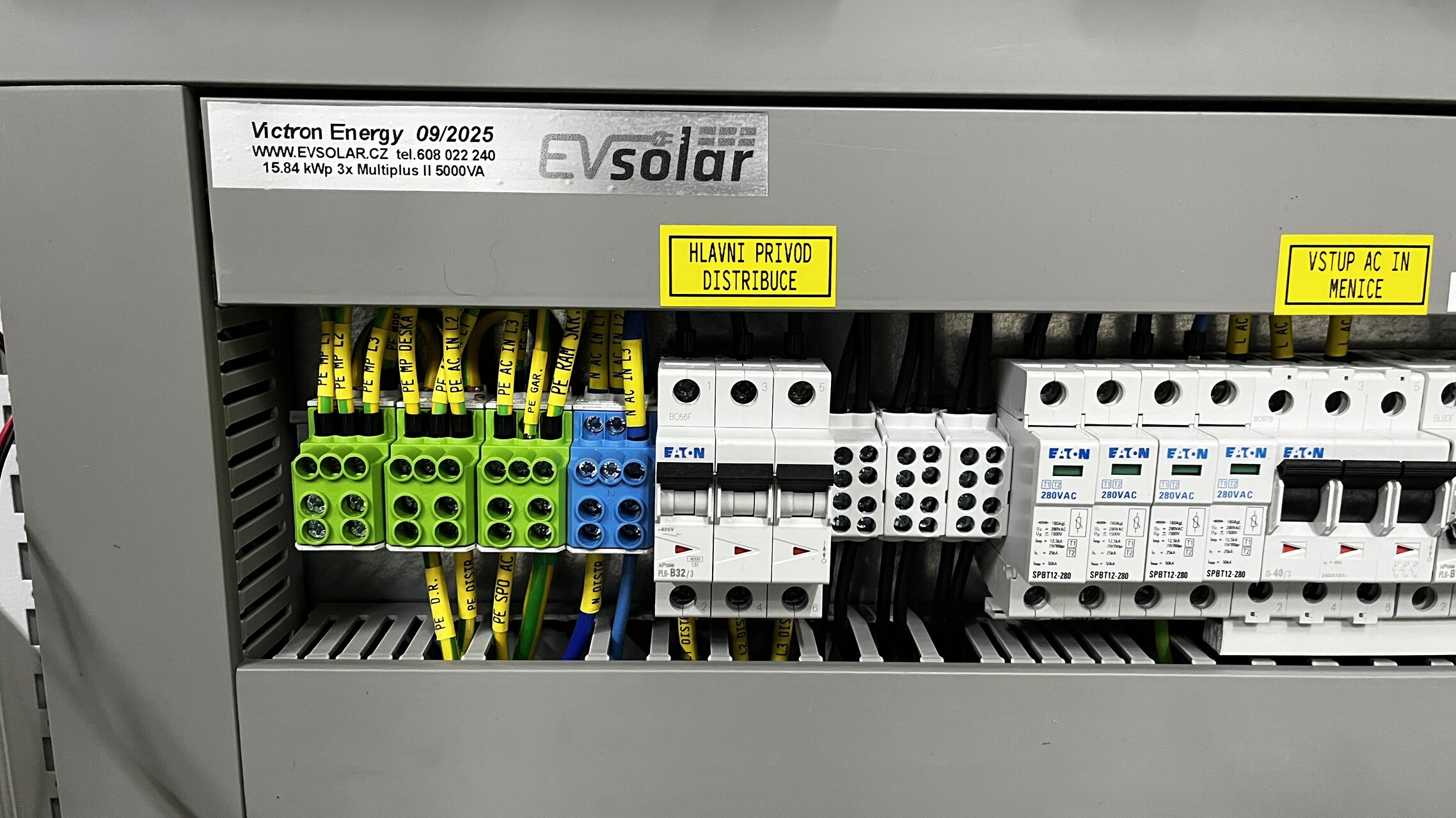 Byl použit systém Victron s měniči 3x Muliplus 5000VA, Baterie Pylontech US5000 5 modulů o celkové kapacitě 24 kWh, Celkem je na třech střechách instalováno 36 kusů solárních panelů Jinko Tiger 440Wp. Každých 9 kusů panelů je zapojeno na jeden regulátor Victron 150/100A s CAN komunikací. Zapojení panelů je na bezpečném napětí do 120V (3S,3P). Celý systém byl navržen pro co největší soběstačnost a po doplnění baterií do kapacity 50-60 kW bude téměř 100% celoroční soběstačnost. Vše je uloženo ve skříni Schrack o rozměru 180x200x60 cm