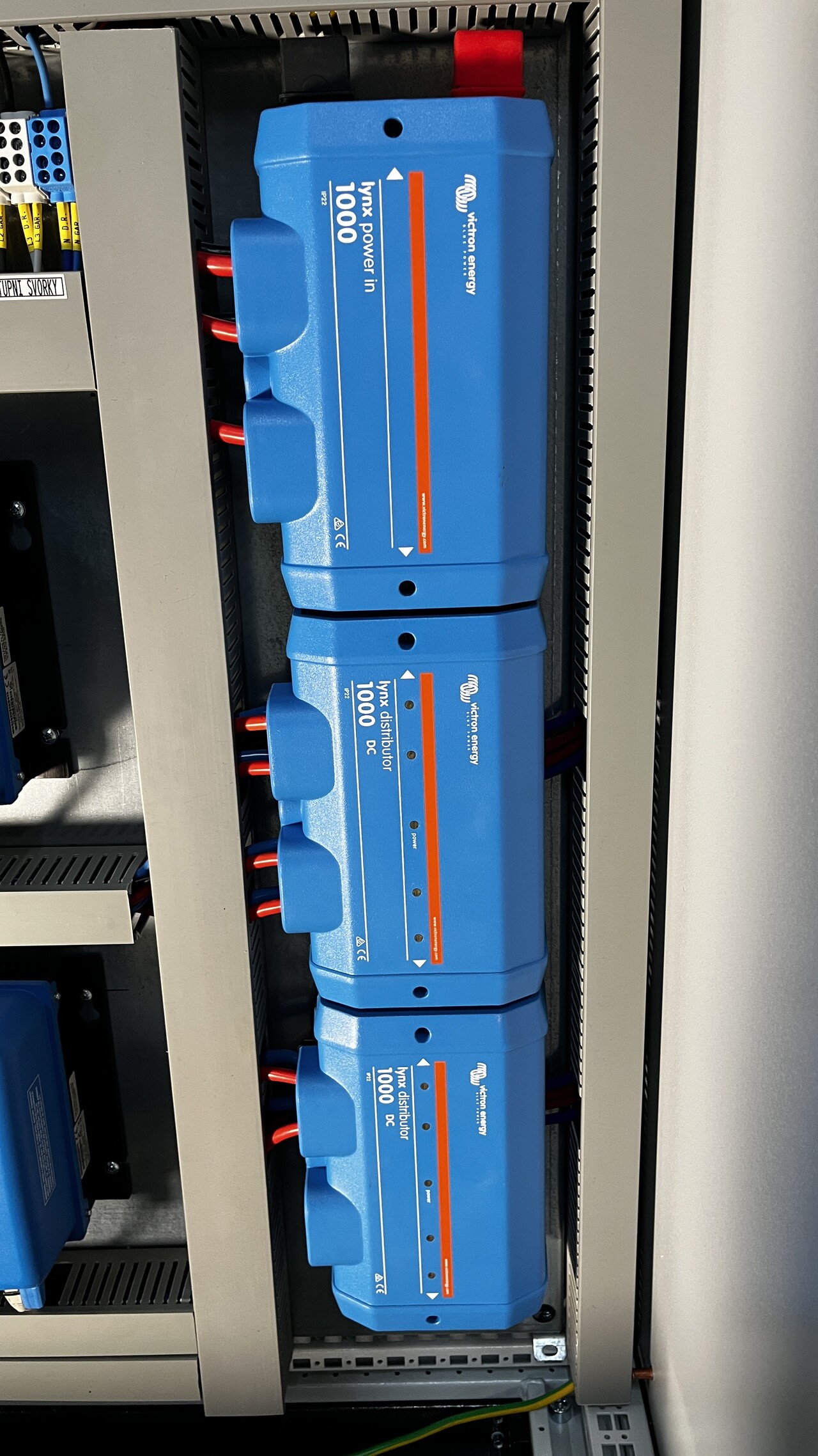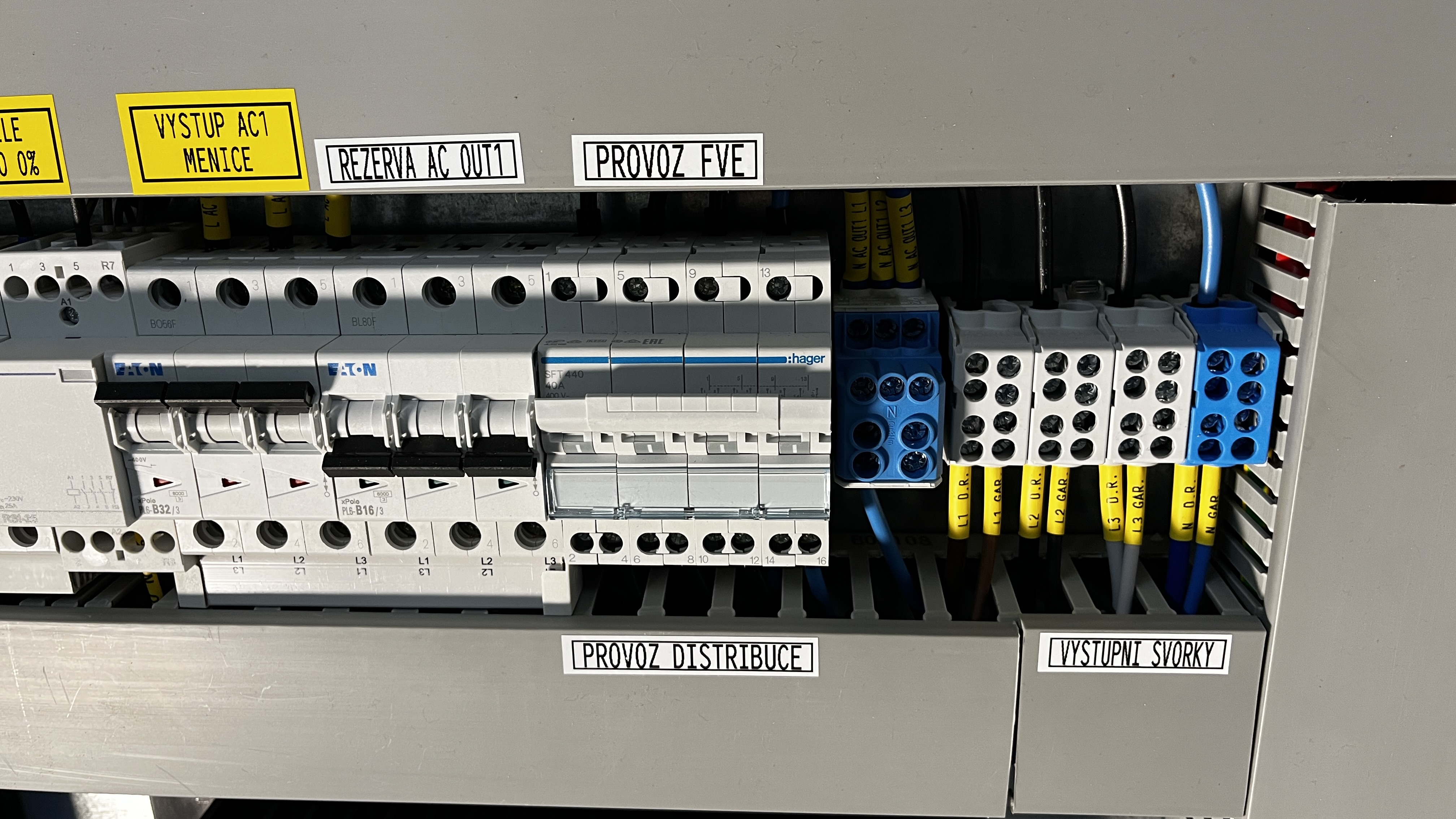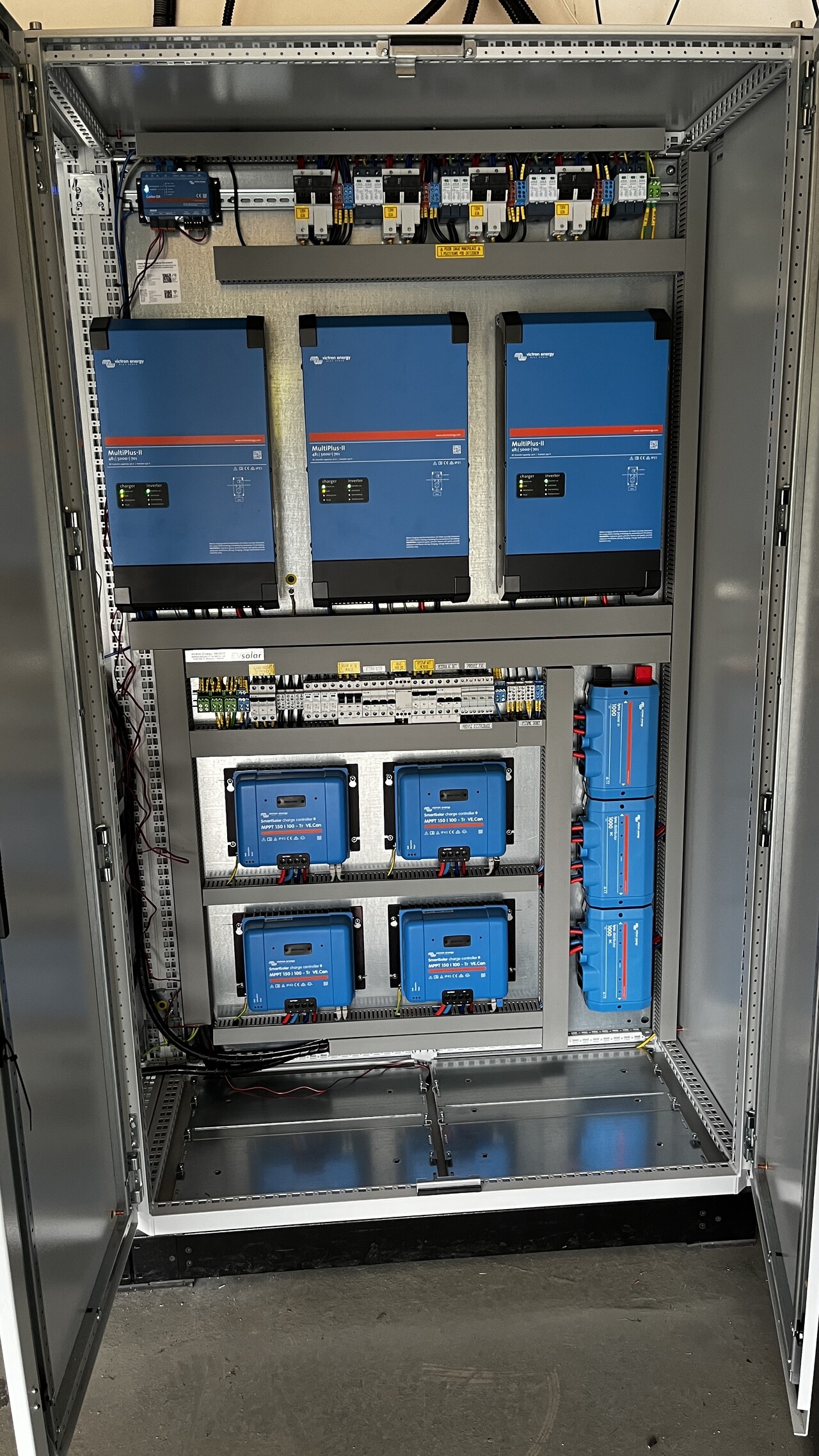 Byl použit systém Victron s měniči 3x Muliplus 5000VA, Baterie Pylontech US5000 5 modulů o celkové kapacitě 24 kWh, Celkem je na třech střechách instalováno 36 kusů solárních panelů Jinko Tiger 440Wp. Každých 9 kusů panelů je zapojeno na jeden regulátor Victron 150/100A s CAN komunikací. Zapojení panelů je na bezpečném napětí do 120V (3S,3P). Celý systém byl navržen pro co největší soběstačnost a po doplnění baterií do kapacity 50-60 kW bude téměř 100% celoroční soběstačnost. Vše je uloženo ve skříni Schrack o rozměru 180x200x60 cm